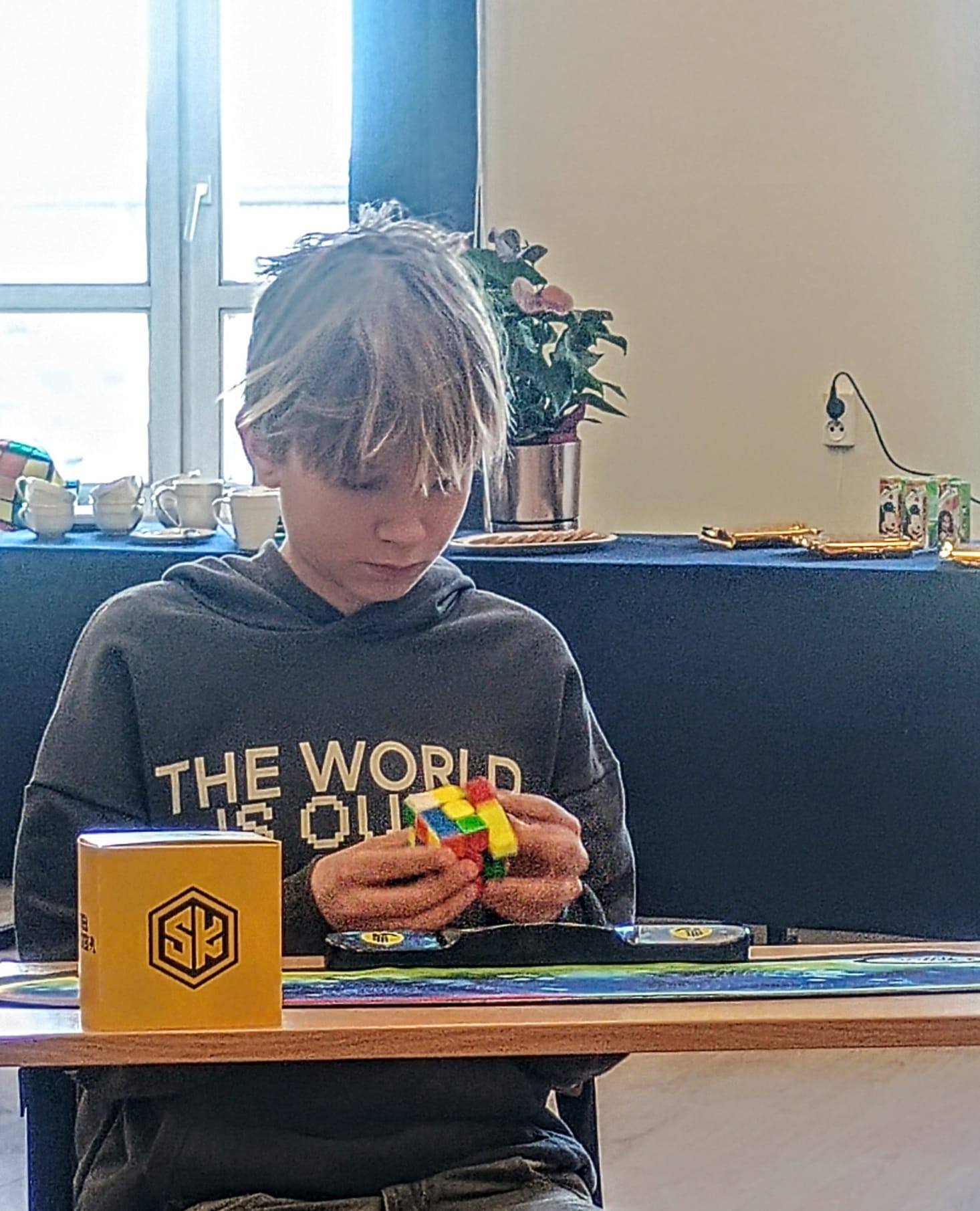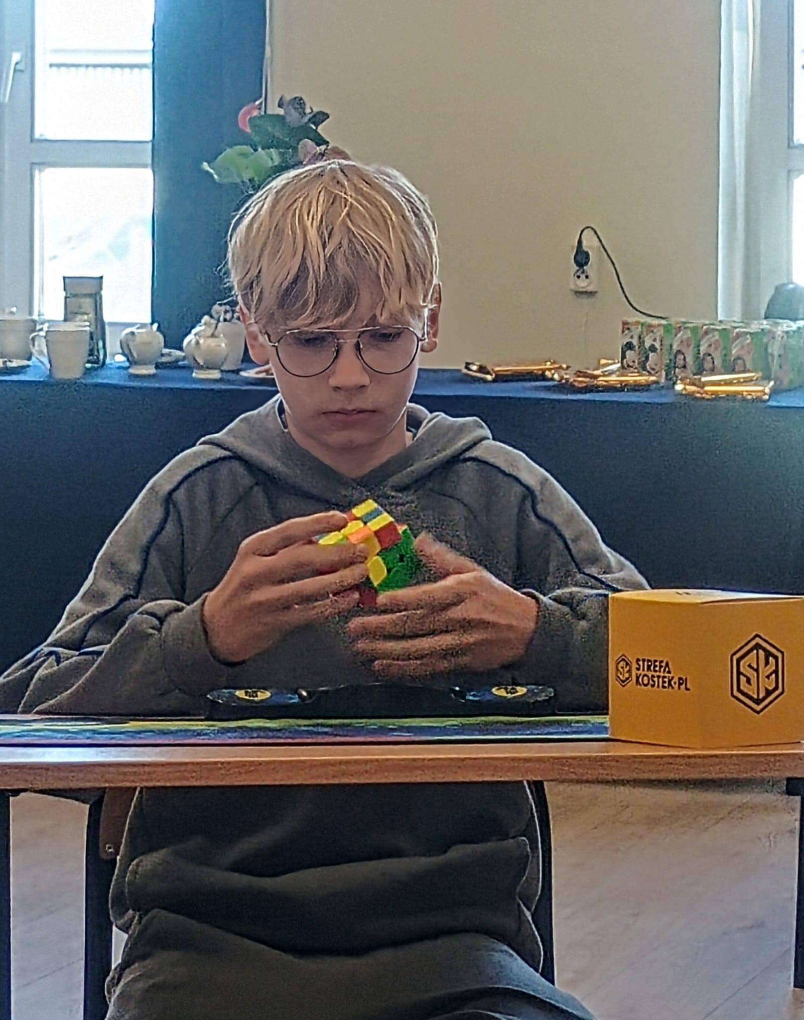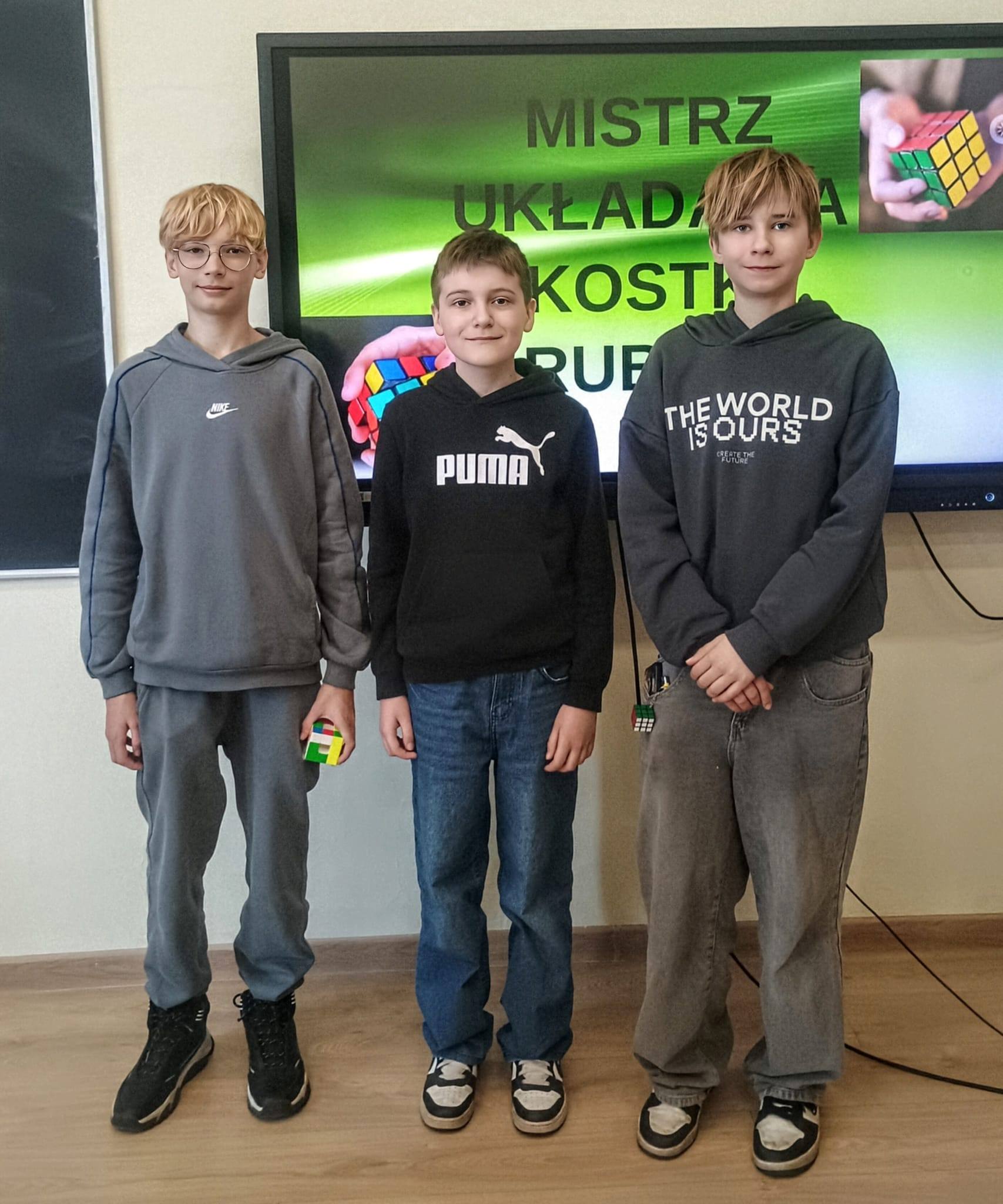 W pierwszej edycji szkolnych mistrzostw Pabianic w układaniu na czas kostki Rubika 3×3×3 naszą szkołę reprezentowali uczniowie klasy 6a: Kamil, Patryk i Nikodem. W pierwszym etapie konkursu wzięło udział 14 uczestników. Do finałowej piątki awansowali Kamil Kmieć oraz Patryk Boruń.