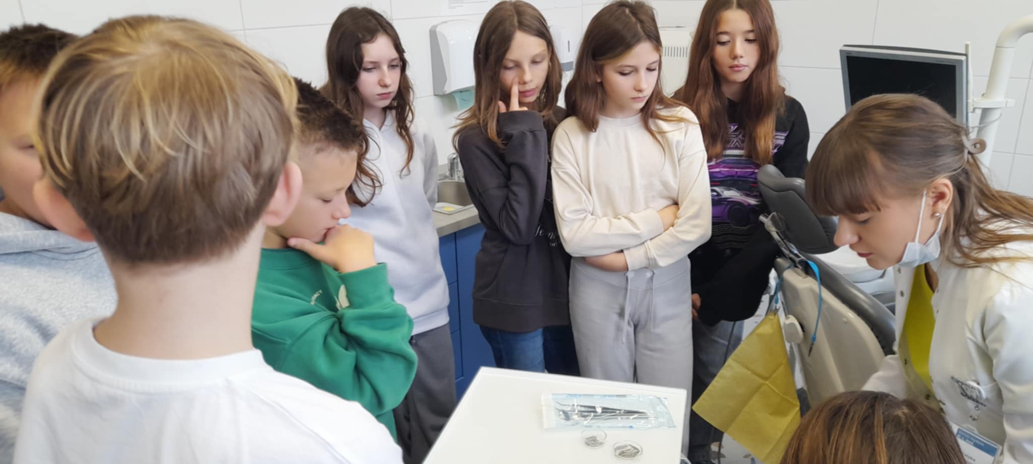 Z kolei uczniowie klasy 6a uczestniczyli w spotkaniu z panią dr Michalak, która przybliżyła im tajniki zawodu dentysty. Dowiedzieli się, jakie cechy powinien mieć stomatolog i jak wygląda jego codzienna praca. Nie zabrakło też pytań – uczniowie z zainteresowaniem słuchali odpowiedzi i dzielili się własnymi doświadczeniami.
